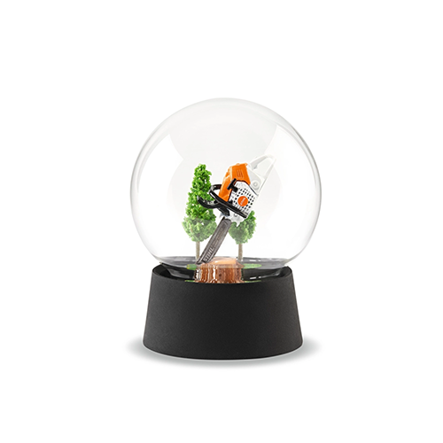 Deze sneeuwbol neemt je mee naar een winterwonderland waar de MS500i motorzaag schittert in een betoverend schouwspel. Schud de bol en zie hoe de sneeuwvlokken dwarrelen rond dit prachtig miniatuurtje van technologische perfectie.