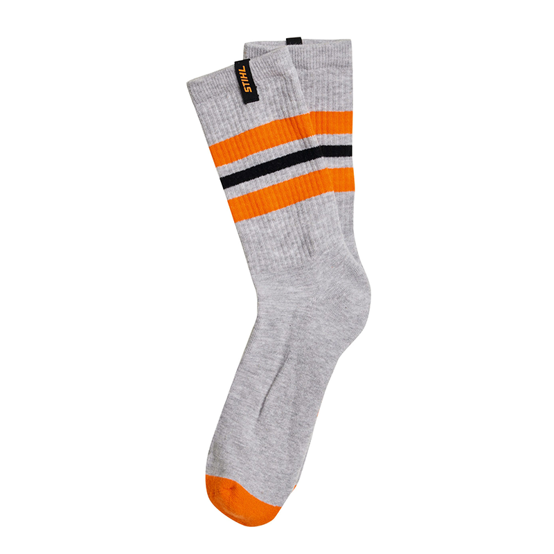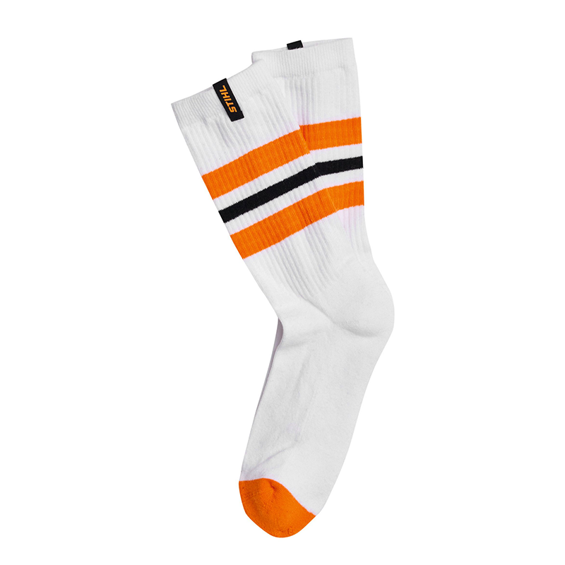 De STIHL STRIPES set sokken zijn geschikt voor veel sport- en vrijetijdsactiviteiten. De kuitlange sokken sluiten goed aan, zakken niet af en snijden ook niet in de huid. De STIHL STRIPES sokken worden geleverd in een 3-pak en bestaat uit witte, zwarte en grijze sokken, alle met oranje strepen.