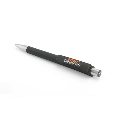Deze balpen heeft een zwarte stift, twee kleine bijltjes op het kliksysteem, soft-touch matte lak en een metalen punt. het ultieme accessoire voor elke reis, huishouden of STIHL TIMBERSPORTS fan!