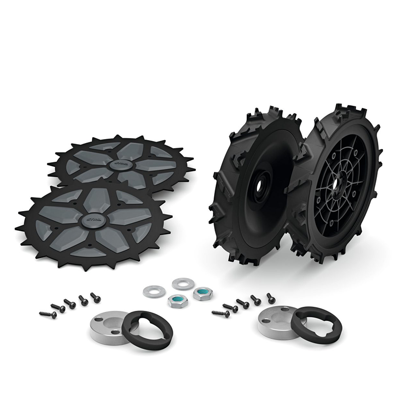 De tractiewielen verhogen de prestaties van je STIHL iMOW® EVO robotmaaier op uitdagend terrein. De speciale aandrijfwielen van de STIHL Upgrade Kit 13 iMOW®, gecombineerd met de meegeleverde noppen en wielgewichten, zorgen voor een optimale werking op ruw of hellend terrein. Ze bieden je robotmaaier extra grip, zelfs op natte of oneffen gazons.