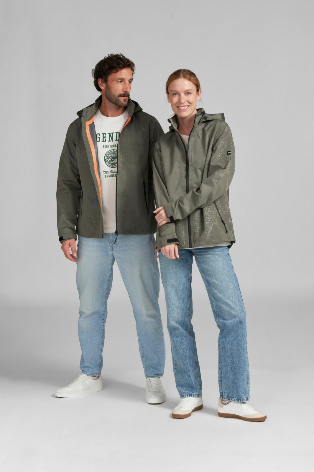 Dit groene uniseks regenjack combineert stijl met functionaliteit dankzij een subtiel all-over pixelmotief. Het biedt uitstekende bescherming tegen wind en regen, terwijl het doorlopende patroon elk jack uniek maakt. De oranje thermisch gelaste binnennaden en de waterdichte stof met een waterkolom van 10.000 mm zorgen ervoor dat je droog blijft, zelfs bij zware regenval. Bovendien is de drielaagse, ademende stof ontworpen voor optimaal draagcomfort. De zijzakken met ritssluiting bieden voldoende ruimte om je persoonlijke spullen veilig op te bergen.