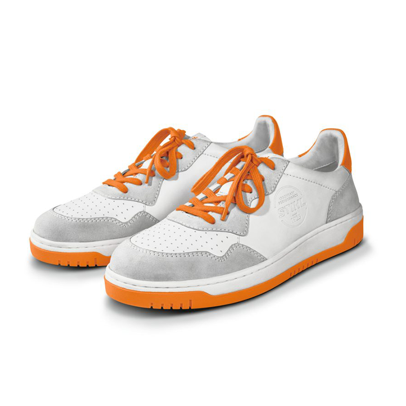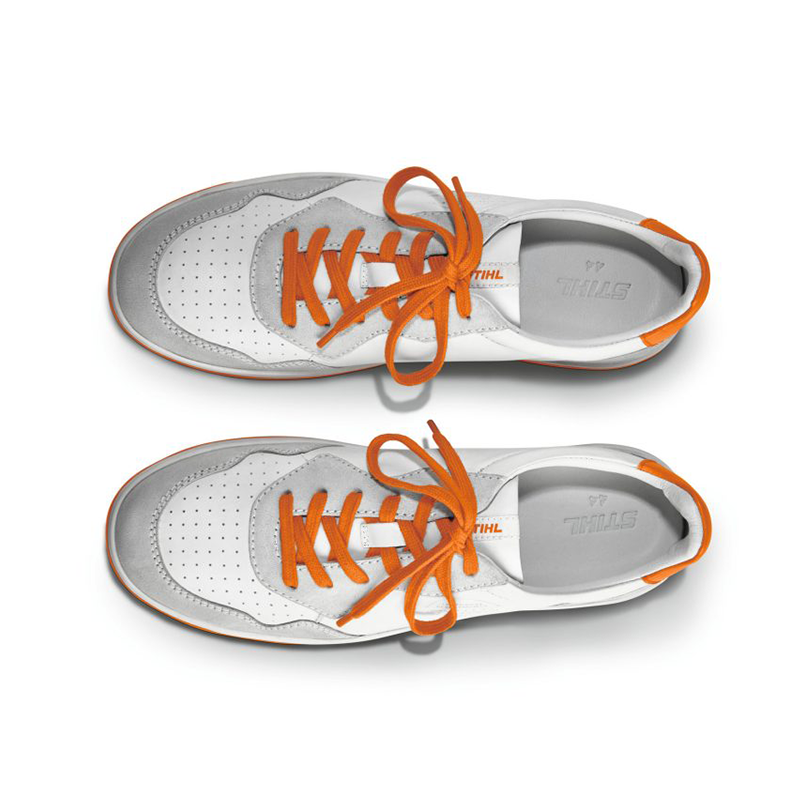 Deze nieuwe witte STIHL sneakers zijn stijlvol en worden snel een favoriet in je collectie. Ze zijn vervaardigd uit 100% leer en voorzien van een uitneembaar voetbed en een oranje inlegzool. De platte katoenen veters in oranje, perforaties aan de voorkant en contrasterende oranje STIHL-details trekken direct de aandacht. Op de buitenkant prijkt een subtiel rond logo met de tekst “STIHL LEGENDARY PERFORMANCE”. Inclusief een extra paar witte veters voor variatie.