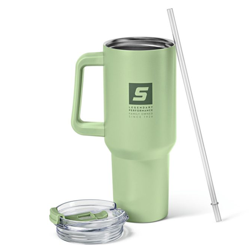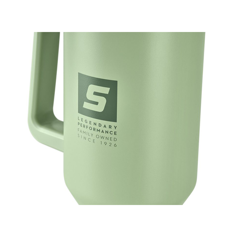 De STIHL isotherme beker in stoer outdoor-design, afgewerkt met het “S”-logo en de tekst “LEGENDARY PERFORMANCE”, combineert gebruiksgemak met een trendy uitstraling. Dankzij het handige formaat en de muntgroene kleur is hij helemaal van nu. Het ergonomische handvat zorgt ervoor dat de beker in vrijwel elke bekerhouder in de auto past.