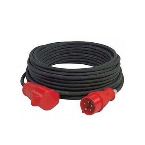 De verlengkabel heeft een lengte van 25 meter en heeft kabels met een doorsnede van 5 x 2,5 mm^2. Je kan kiezen tussen een 16 ampère en een 32 ampère stekker/contra.